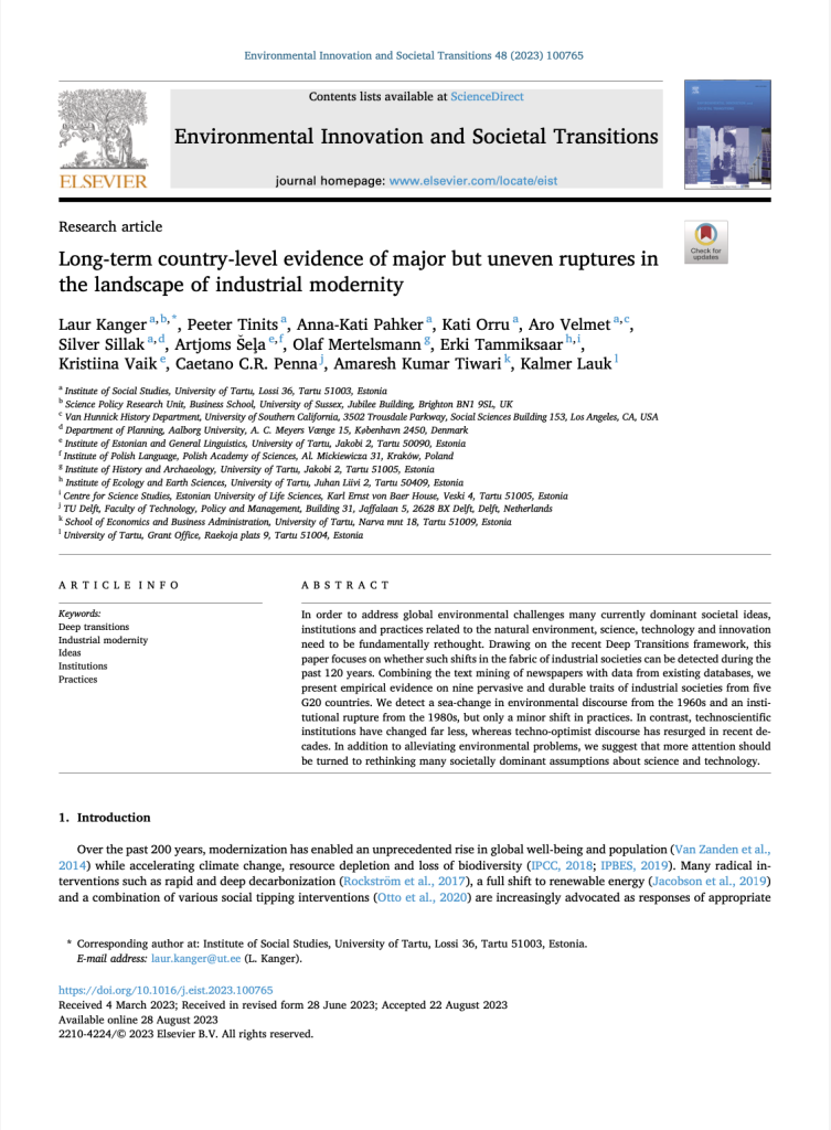 Kanger, L., Tinits, P., Pahker, A.-K., Orru, K., Velmet, A., Sillak, S., … & Lauk, K. (2023). Long-term country-level evidence of major but uneven ruptures in the landscape of industrial modernity. Environmental Innovation and Societal Transitions, 48, 100765. DOI: https://doi.org/10.1016/j.eist.2023.100765