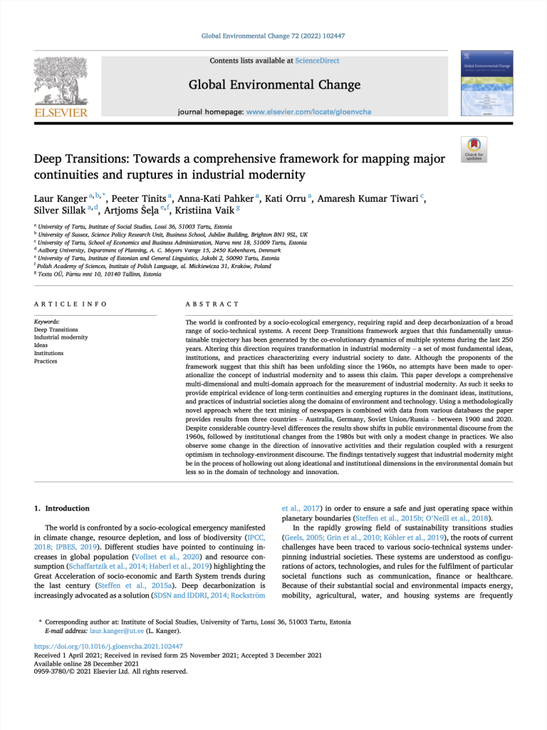 Kanger, L., Tinits, P., Pahker, A.-K., Orru, K., Tiwari, A. K., Sillak, S., … & Vaik, K. (2022). Deep Transitions: Towards a comprehensive framework for mapping major continuities and ruptures in industrial modernity. Global Environmental Change, 72, 102447. DOI: https://doi.org/10.1016/j.gloenvcha.2021.102447