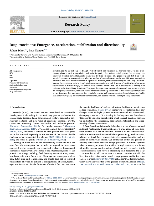 Schot, J. & Kanger, L. (2018). Deep transitions: Emergence, acceleration, stabilization and directionality. Research Policy, 47(6), 1045-1059. DOI: https://doi.org/10.1016/j.respol.2018.03.009