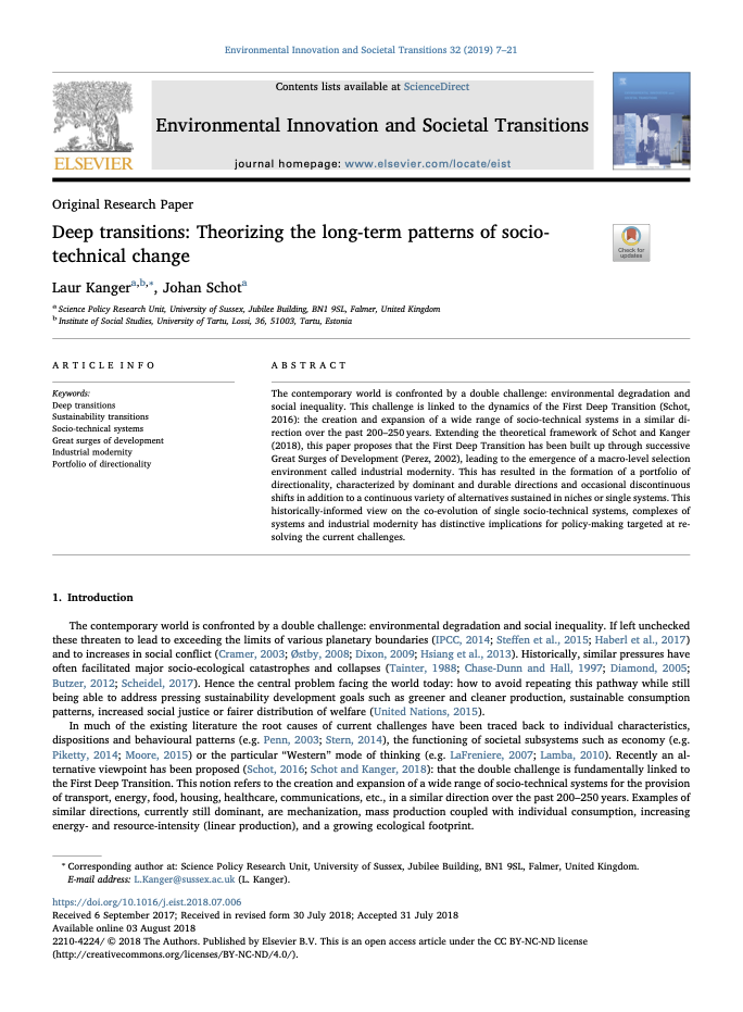 Kanger, L., & Schot, J. (2019). Deep transitions: Theorizing the long-term patterns of socio-technical change. Environmental Innovation and Societal Transitions, 32, 7-21. DOI: https://doi.org/10.1016/j.eist.2018.07.006