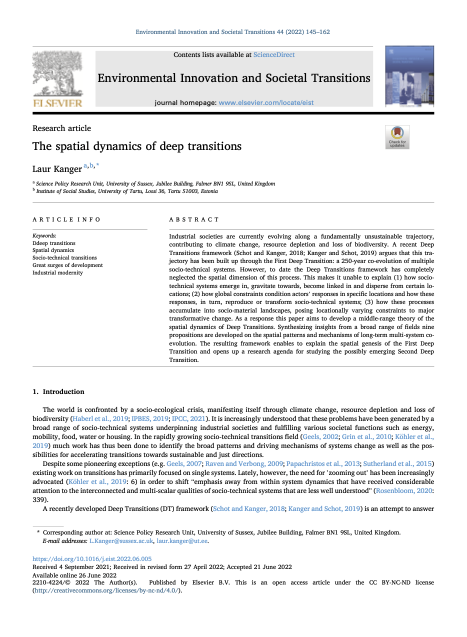 Kanger, L. (2022). The spatial dynamics of deep transitions. Environmental Innovation and Societal Transitions, 44, 145-162. DOI: https://doi.org/10.1016/j.eist.2022.06.005