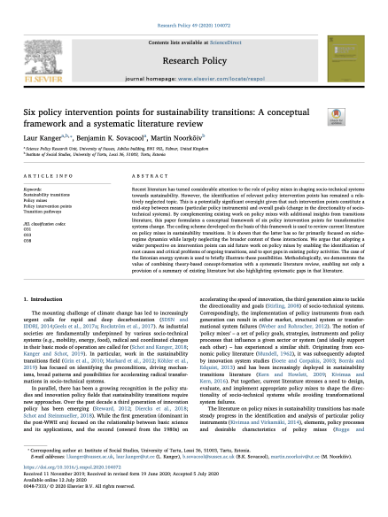 Kanger, L., Sovacool, B. K., & Noorkõiv, M. (2020). Six policy intervention points for sustainability transitions: A conceptual framework and a systematic literature review. Research policy, 49(7), 104072. DOI: https://doi.org/10.1016/j.respol.2020.104072