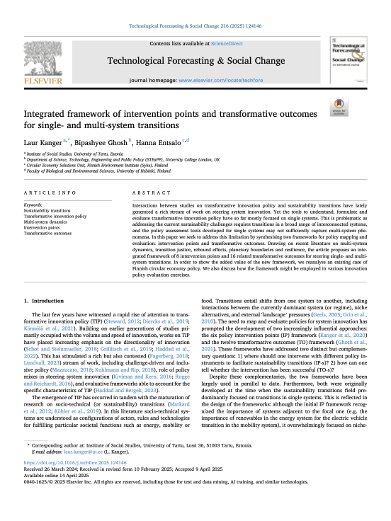 Kanger, L., Ghosh, B., & Entsalo, H. (2025). Integrated framework of intervention points and transformative outcomes for single-and multi-system transitions. Technological Forecasting and Social Change, 216, 124146. DOI: https://doi.org/10.1016/j.techfore.2025.124146